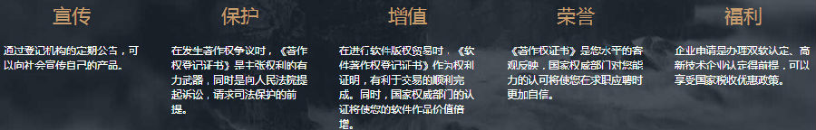 可以向社会宣传自己的产品可以维护作者或其他著作权人和作品使用者的合法权益有利于作品,软件的传播和经济价值的实现。同时,国家权威部门的认证将使您的软件作品价值倍增申请人可享受《产业政策》所规定的有关鼓励政策有利于个人自我价值的体现,是企业创新实力的表现,增强企业市场的有效竞争力。     所需资料